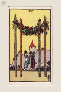 Khung cảnh này gợi đến một lễ cưới, một buổi họp mặt chào đón, hoặc một nghi lễ đánh dấu bước chuyển từ cá nhân sang cộng đồng. Đây là nơi linh hồn cảm thấy mình thuộc về nơi chốn để cắm rễ, để an cư, để được công nhận và nâng đỡ, để có trải nghiệm đa dạng và phong phú hơn. Sau ý tưởng ban đầu (Ace of Wands), sau quá trình hoạch định và mong đợi (Two of Wands), sau những bước đầu thực thi và mở rộng (Three of Wands). Thì Four of Wands là khoảnh khắc niềm vui được chia sẻ nơi hành động được tán thưởng, nơi sáng tạo được ghi nhận, nơi tinh thần được nuôi dưỡng bằng sự hiện diện đầy đủ của những người đồng hành.
